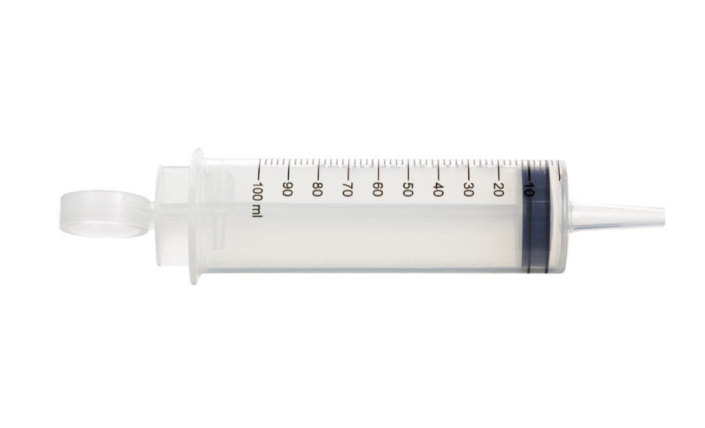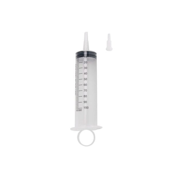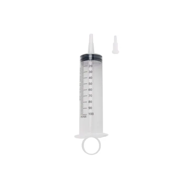 100 ml-es fecskendő katéter vég, 3 részes, egyszer használatos. Gumidugós. Kombinált fóliatasakba egyesével sterilen csomagolva. Katéter csatlakoztatható hozzá, de tartozéka a szűkítő fej, ami lehetővé teszi az egyszer használatos tűk csatlakoztatását is a fecskendőhöz, valamint egy Luer adapter.