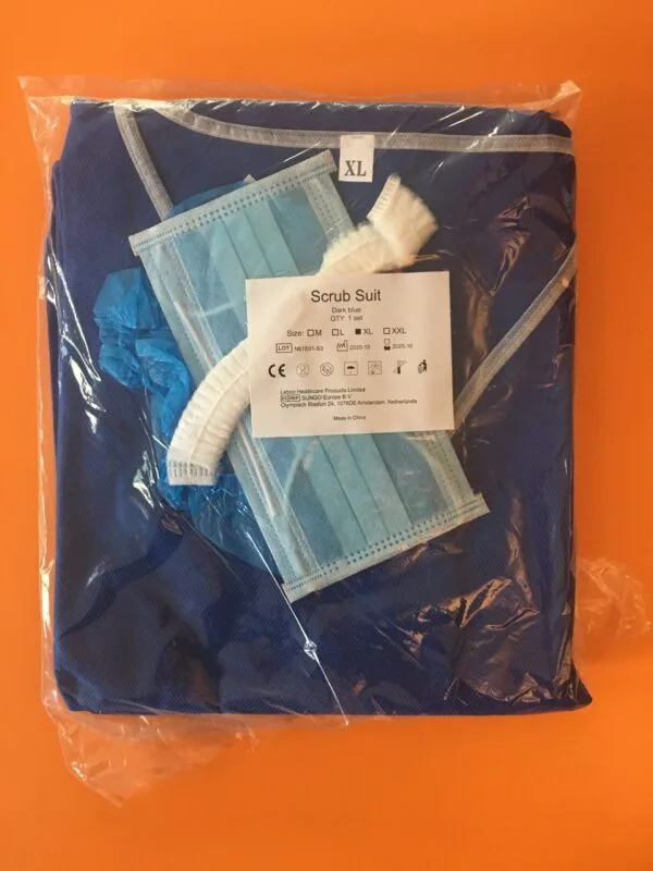 Tartalma: 1 db PP ing+nadrág, 1 db PP kék harmonikás hajháló, 1 db kék 3-rétegű gumis szájmaszk, 1 pár PE cipővédő