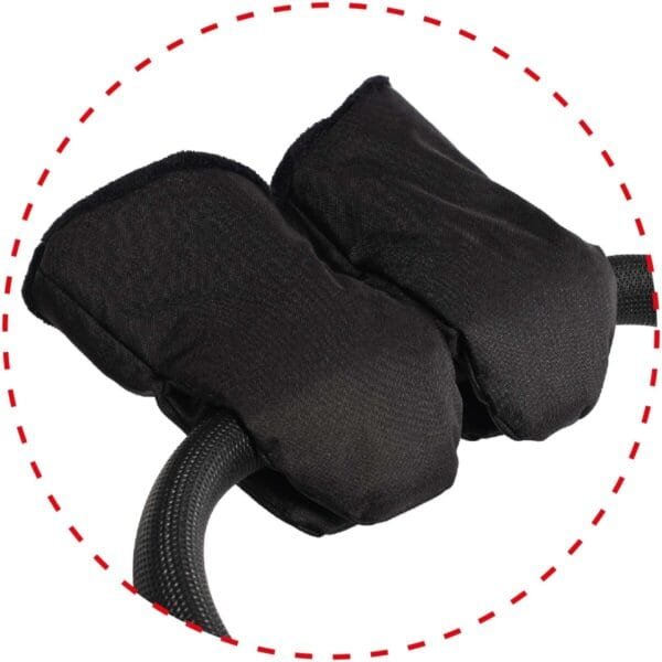 A kerekesszék tolófogantyújára patentokkal felerősíthető téli kesztyű erős, strapabíró és vízhatlan anyagból.
