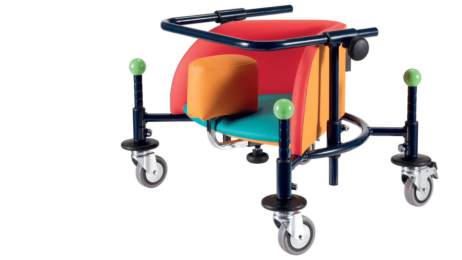 Ezzel a speciális járástrénerrel a biztonság és a szórakozás kéz a kézben járnak . Az ülés háromszög alakú, hogy megakadályozza a túlzott csípő- és törzsnyúlványt, míg az ékes visszahúzó tartja a medencét. Ezeknek a tulajdonságoknak köszönhetően serkenti a gyermek helyes testtartását anélkül, hogy gátolja a törzs forgását, kedvezve a karokon keresztüli mozgáskezelésnek. A biztonság további garantálása érdekében az Ormesa önkioltó kárpitozást és egy nem mérgező porral festett acélkeretet adott hozzá.