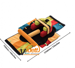 A szőnyeg szélein kis hurkok vannak, amikhez játékokat kapcsolhatunk, így azok nem kerülnek távol a gyermektől. A két hengert magában is lehet használni játéknak, kézügyesség fejlesztéséhez, vagy a többi tartozékkal együtt, hogy stabilabban üljön a gyermek. A pozicionáló övet a gyermek biztonságos ültetéséhez használhatjuk. A has / fejtámaszt használhatjuk ülő pozícióban, hogy stabilizáljuk a gyermek fejét, vagy törzsét. A kis és nagy patkó azért lett kifejlesztve, hogy megfelelő tartást biztosítson a gyermeknek az üléshez hátulról és oldalról egyaránt. Támasztja a hátának majdnem teljes egészét, miközben kezei szabadon mozoghatnak.