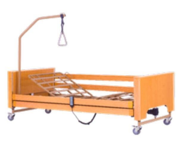Otthoni és kórházi használatra egyaránt alkalmas elektromos betegágy, fa szerkezetű matractartóval; lábtámlával és fejtámlával, bükk színű acélvázzal a nagyobb stabilitás érdekében.